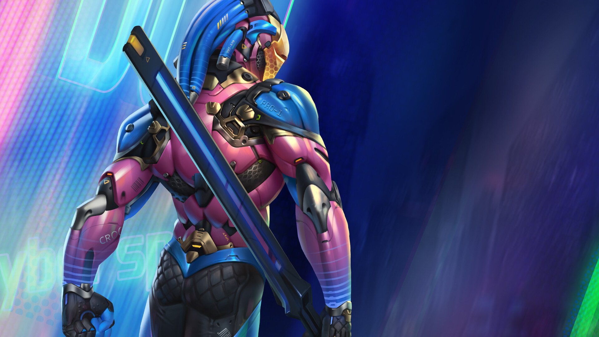 Description: A woman in a pink and blue outfit holding a pair of skis and a pair of ski poles.