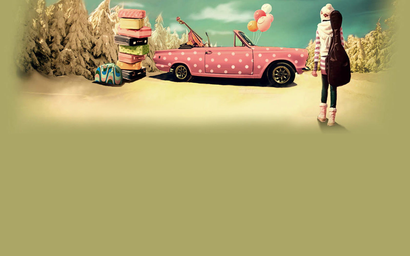 Description: A woman standing next to a pink car with a pink polka dot top and a stack of books on the roof.