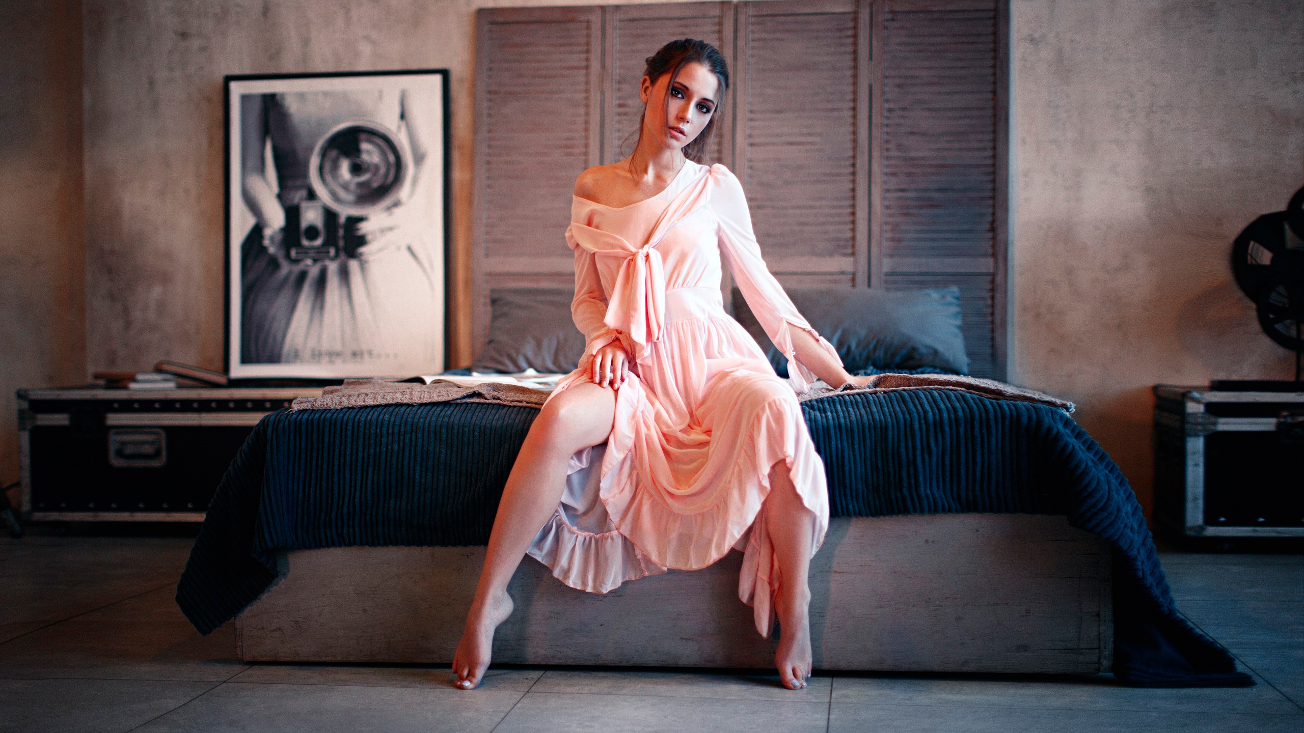 Description: A woman in a pink dress sitting on a bed in a room with a painting on the wall and a painting on the wall.