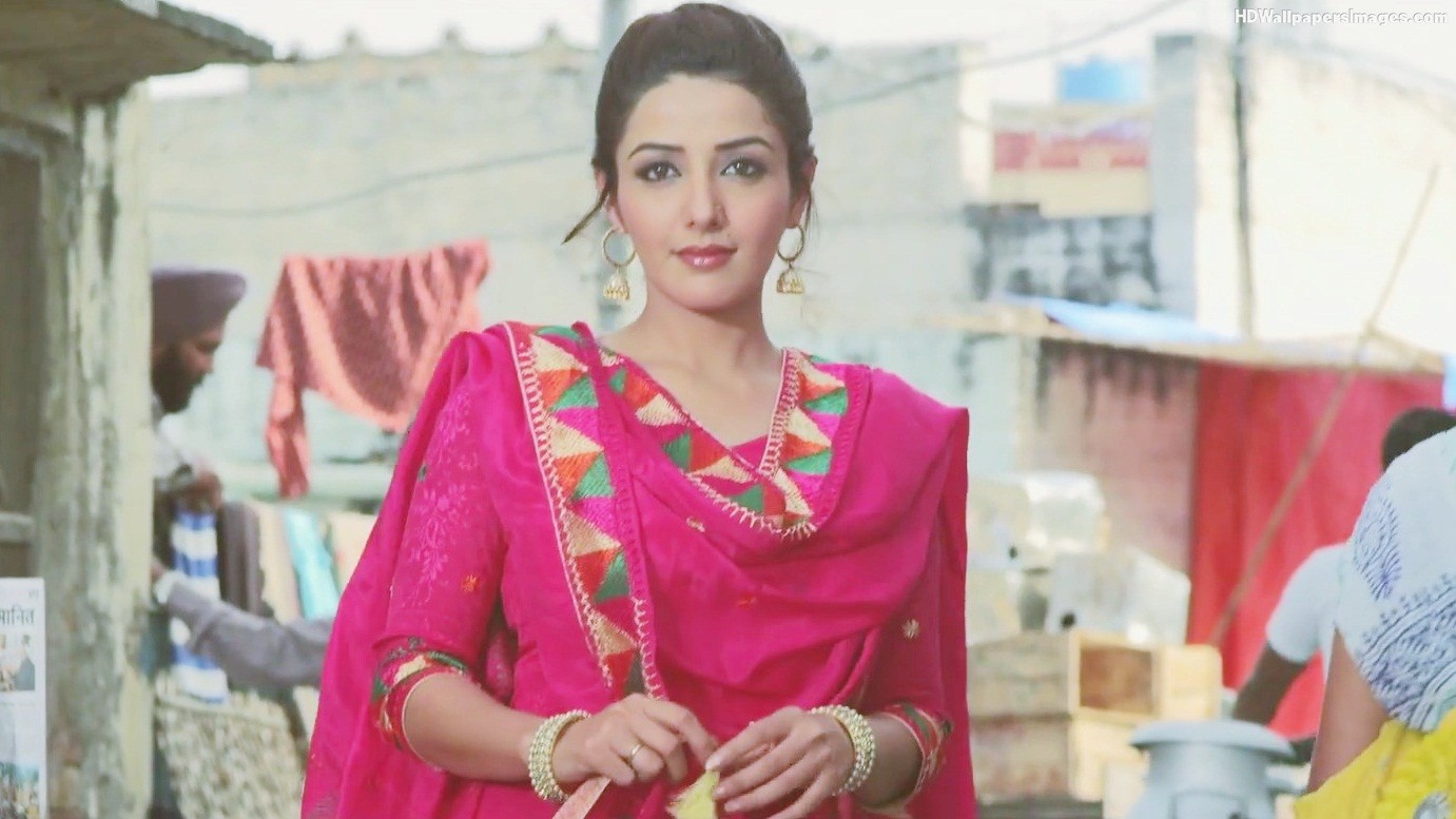 Description: A woman in a pink dress and gold jewelry standing in a village area with a man in the background.