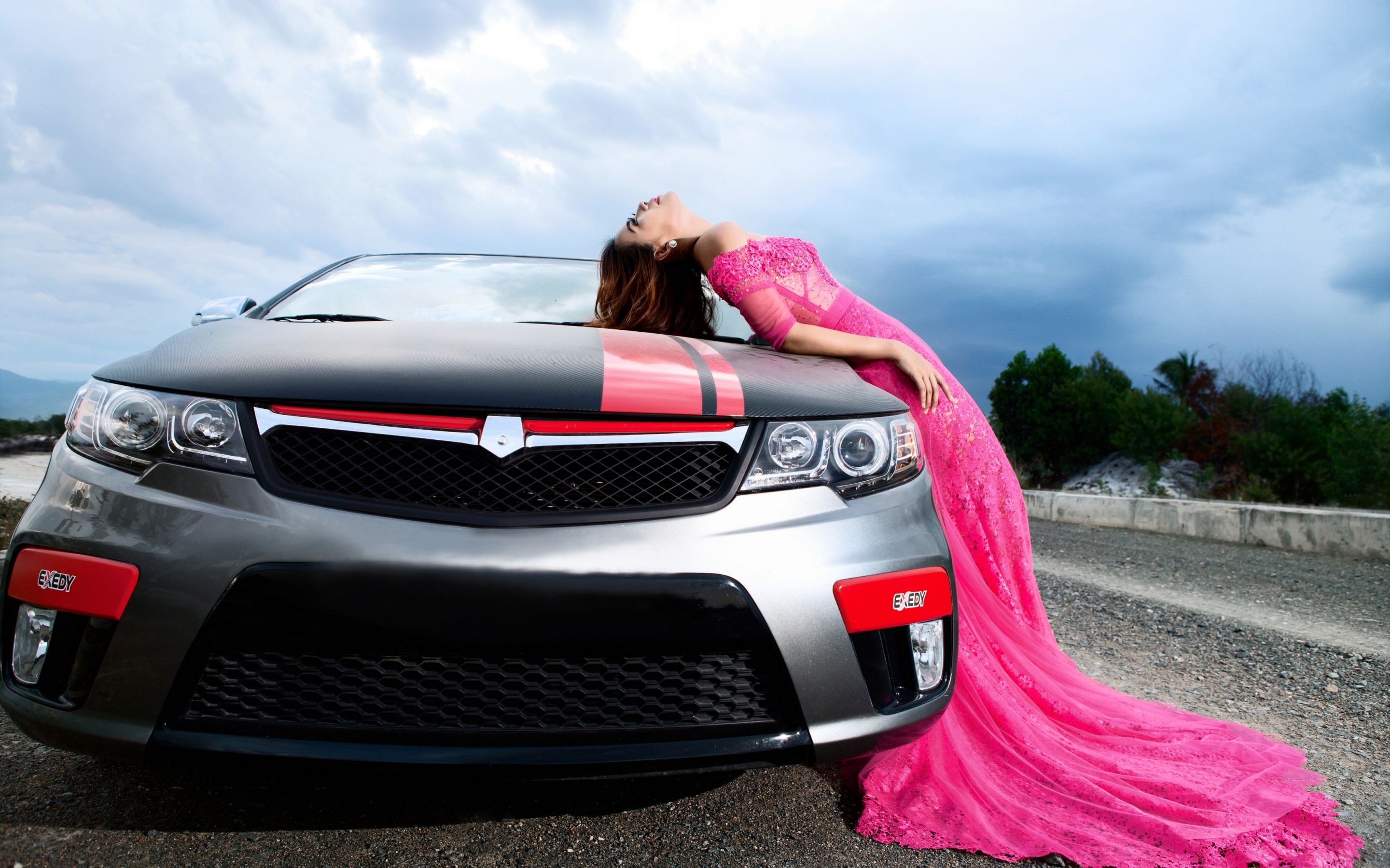 Description: A woman leaning on the hood of a car on a road with a cloudy sky in the background and a pink dress on.