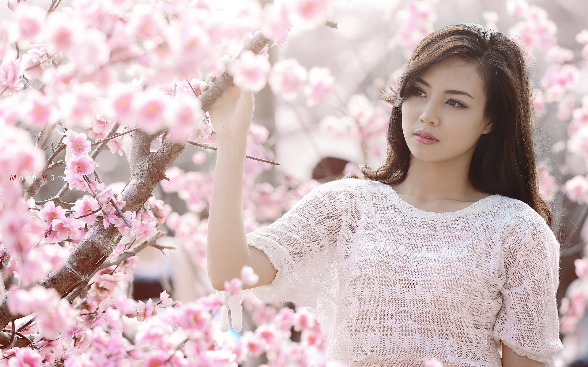 Description: A woman standing in front of a tree with pink flowers on it's branches and a white shirt on.