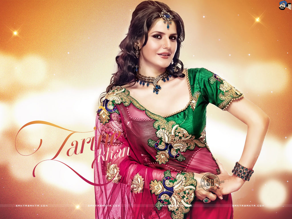Description: A woman in a pink and green sari with a name written on it and a gold and red background.