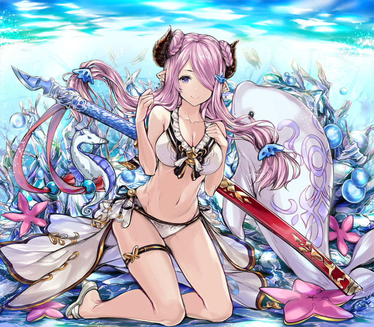Description: A woman with pink hair and horns sitting on the ground with a sword in her hand and a demon on her shoulder.