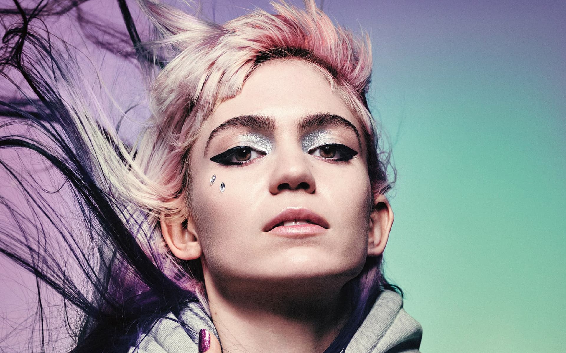 Description: A woman with pink hair and makeup on her face and a hoodie on her head and a hair flying in the wind.