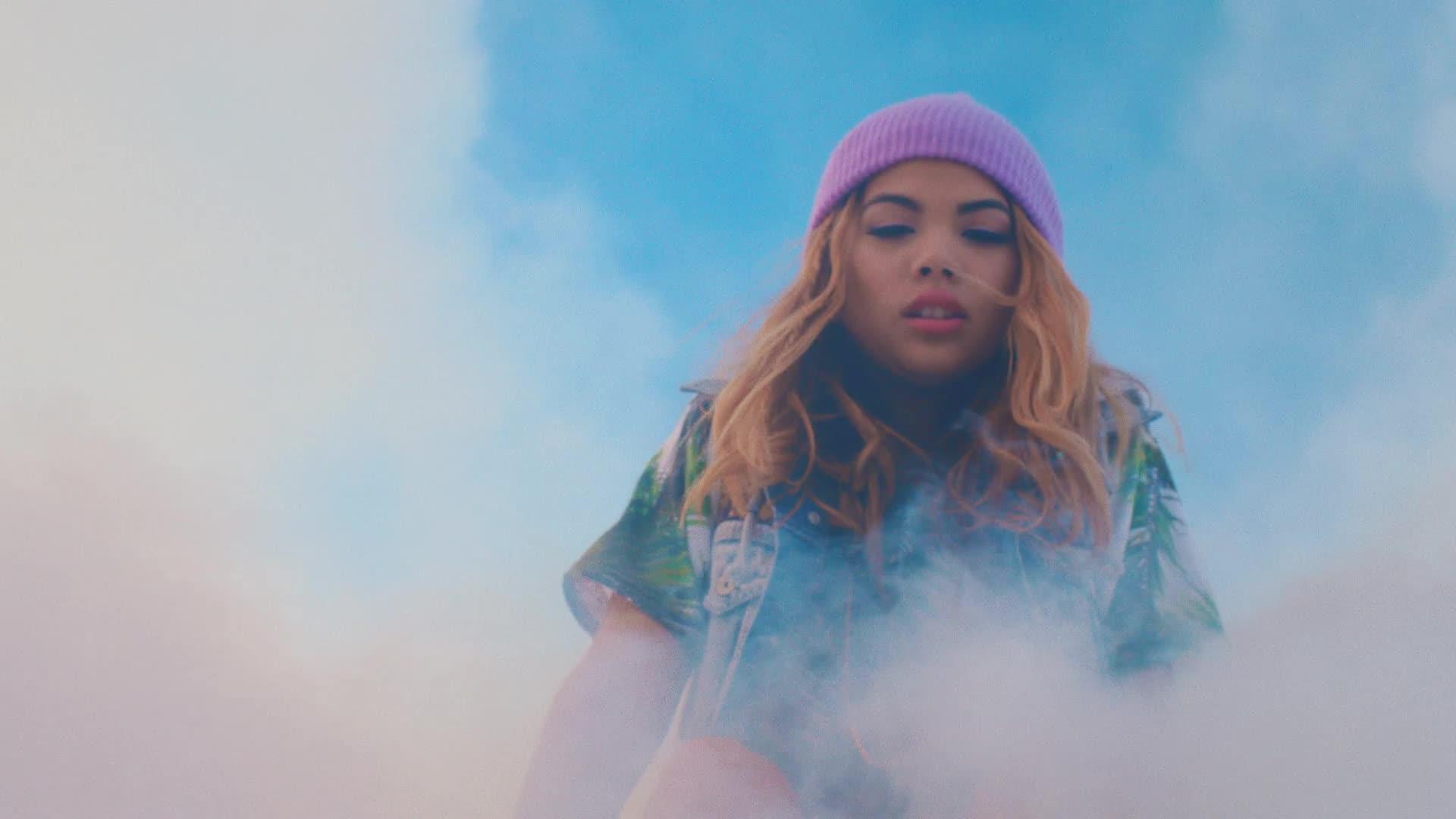 Description: A woman with a pink hat is standing in smoke with her eyes closed and her hair blowing in the wind.