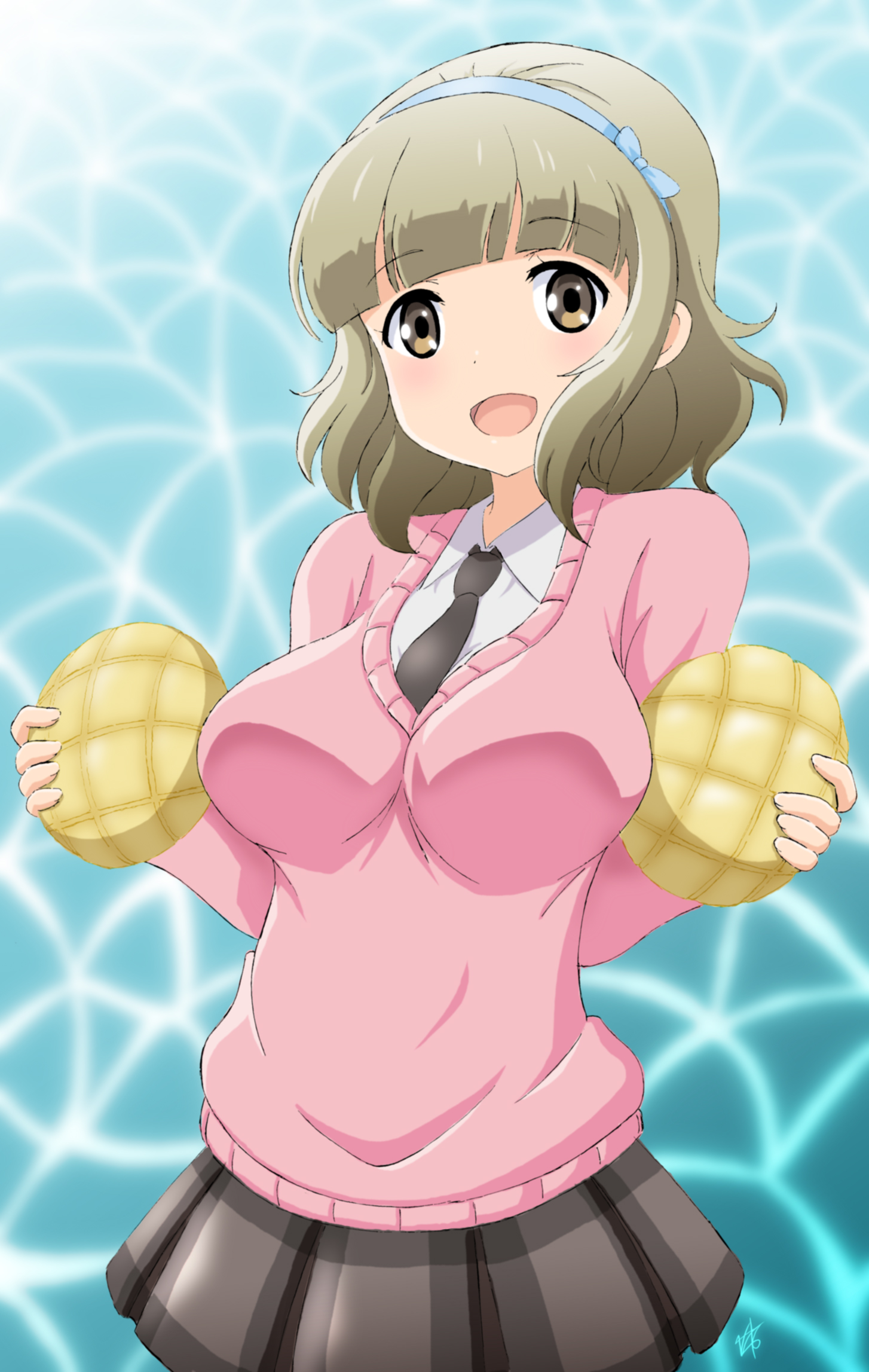 Description: A woman in a pink shirt and black skirt holding a ball in her hands and a blue background with circles.