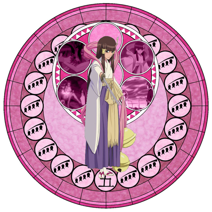 Description: A woman in a long dress standing in front of a pink stained glass window with a pink background and a pink circle.