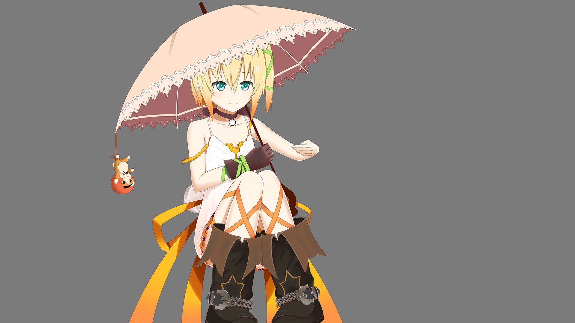 Description: A woman with a pink umbrella standing on a gray background with a yellow ribbon around her neck and boots.