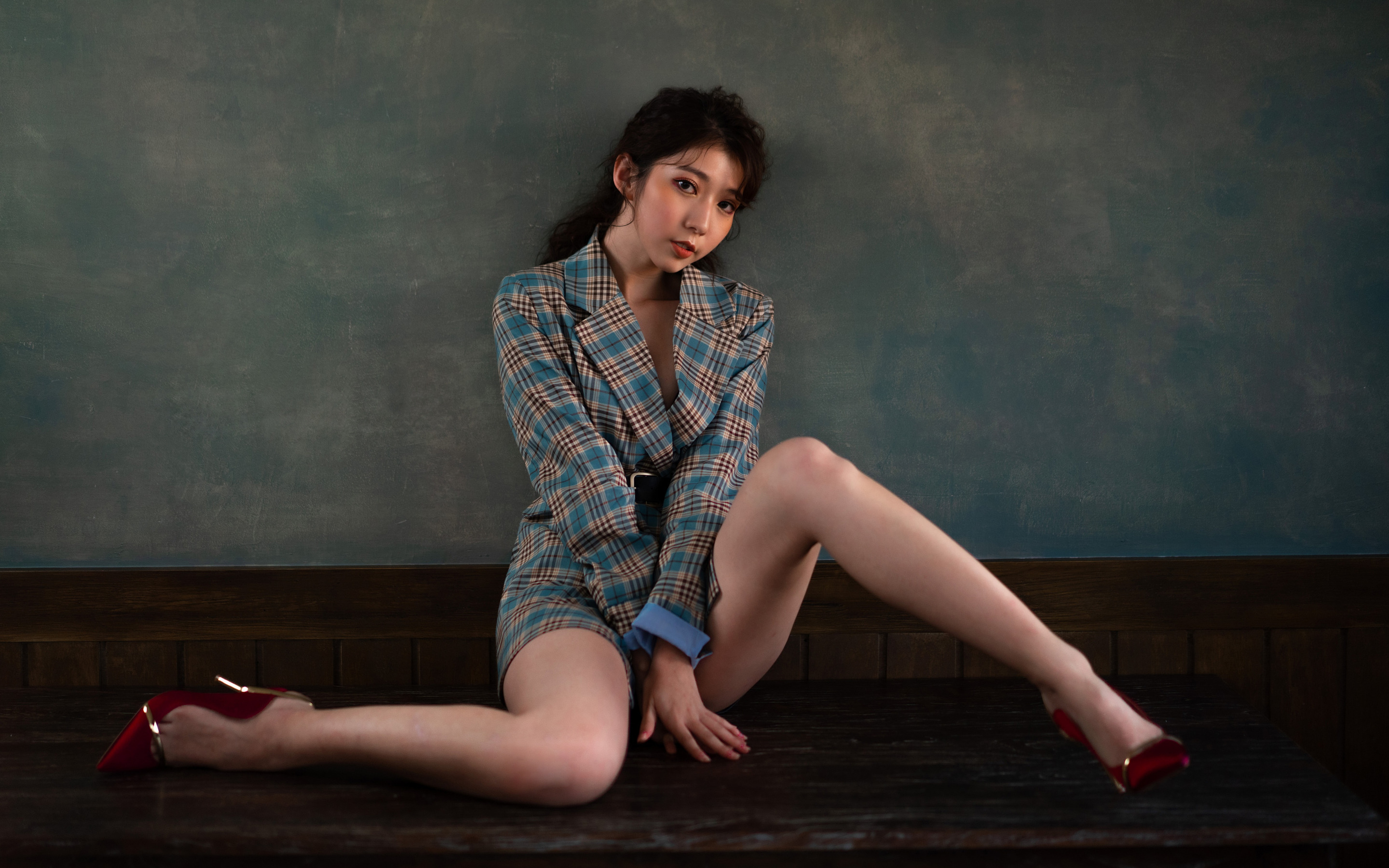 Description: A woman in a plaid jacket and red shoes sitting on a table with her legs crossed and her legs crossed.