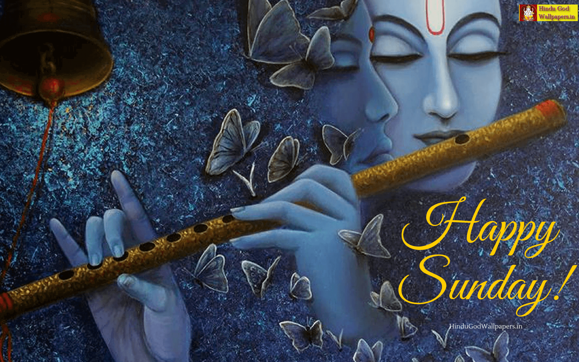 Description: A painting of a woman playing a flute with butterflies surrounding her and a bell on the side of the wall.