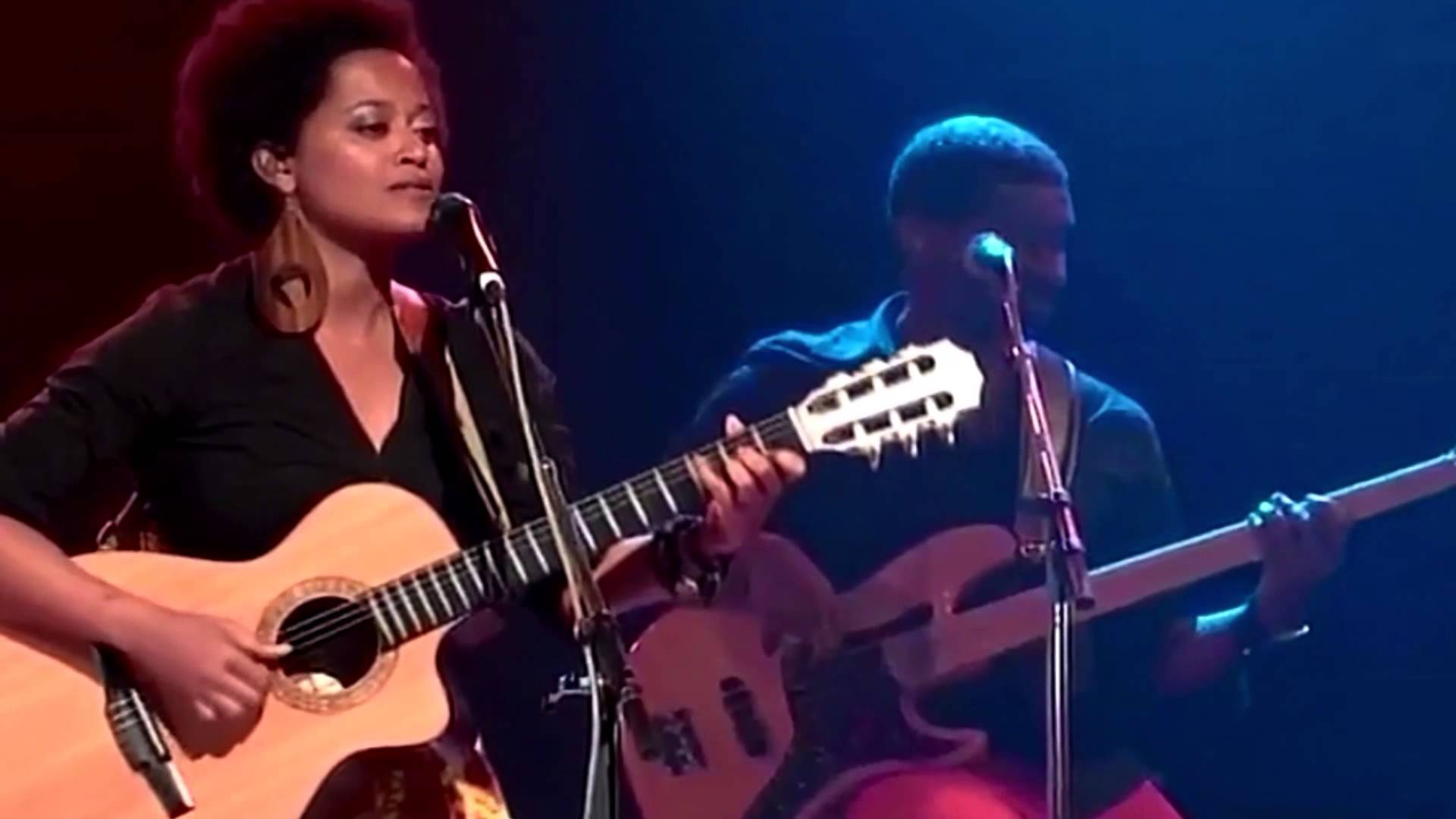 Description: A woman playing a guitar and singing into a microphone while a man plays a guitar behind her on stage.