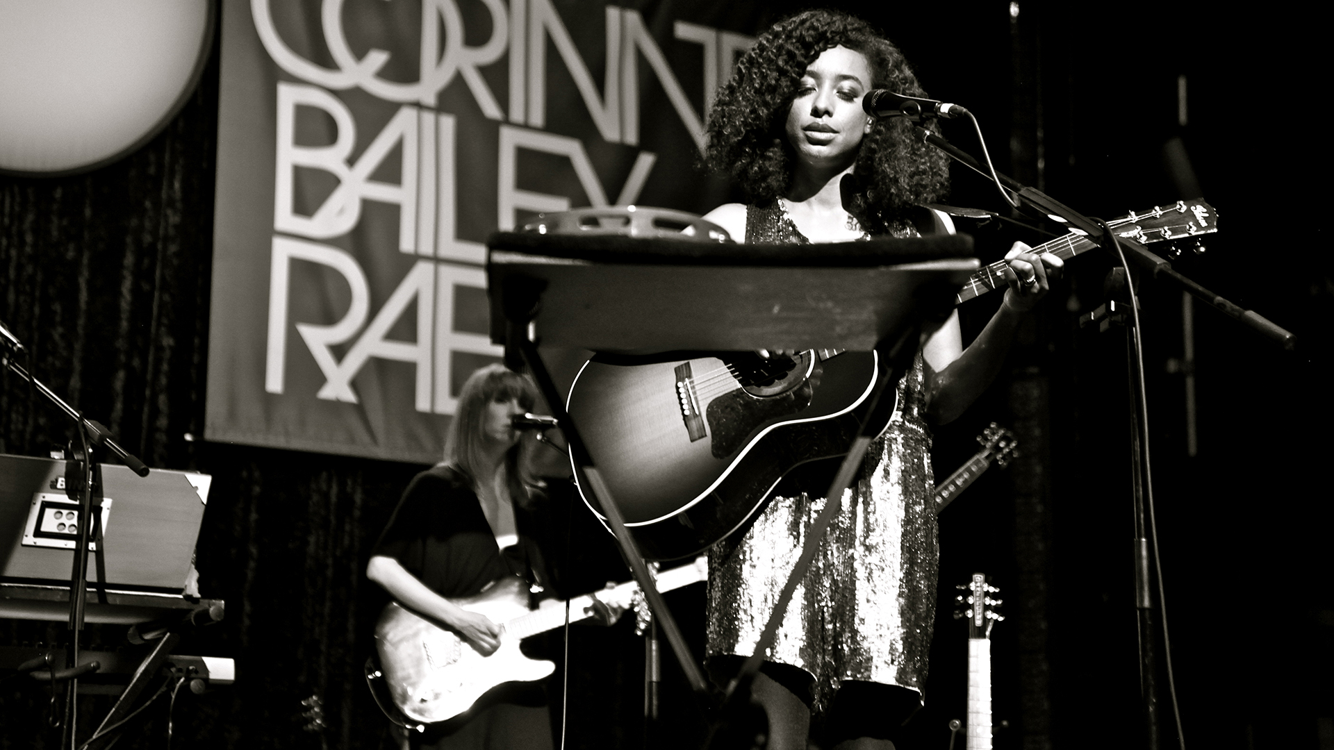 Description: A woman playing a guitar and singing into a microphone on stage with a microphone and a microphone stand behind her.