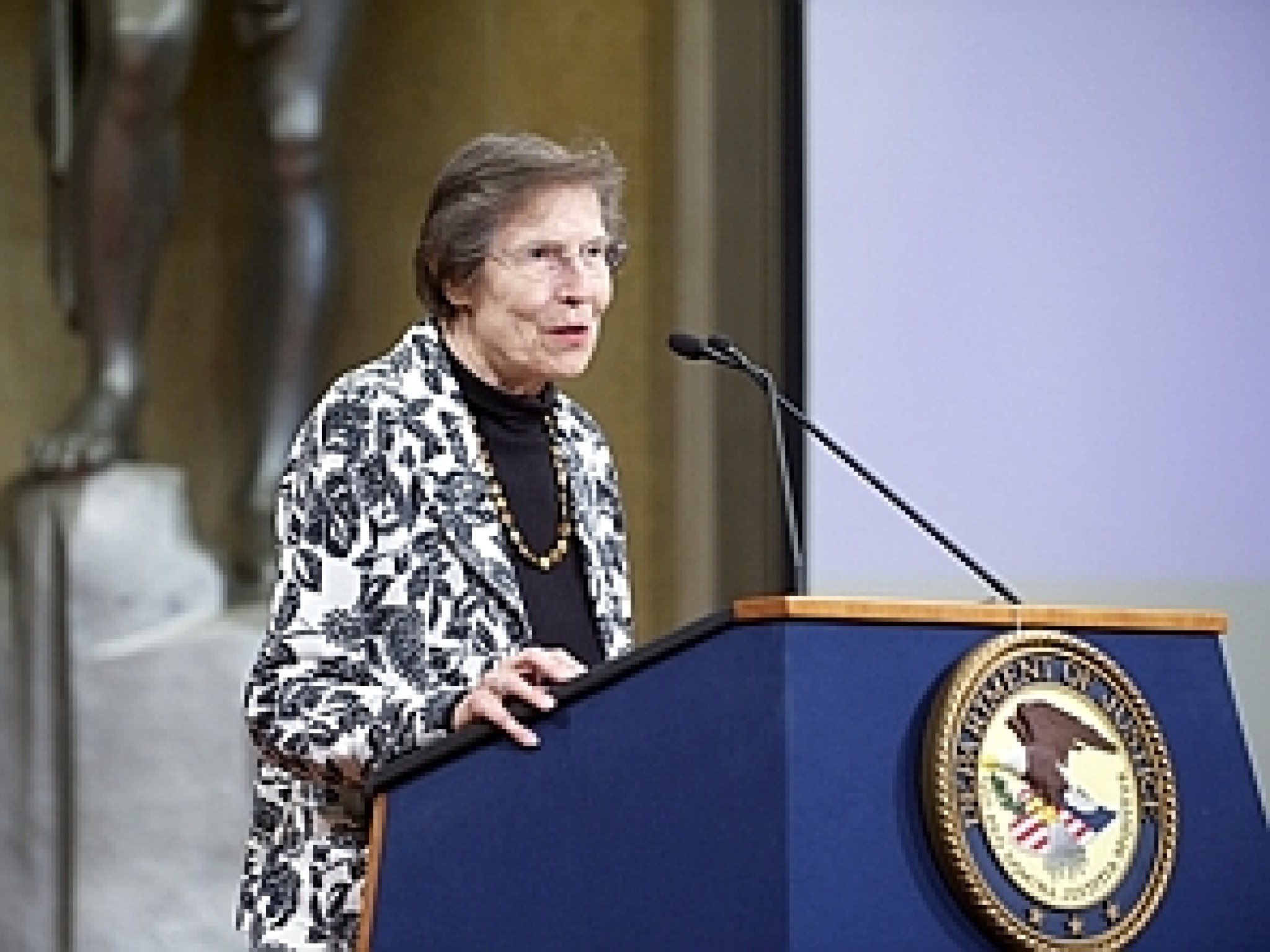 Description: A woman standing at a podium with a microphone in front of her and a statue behind her in the background.