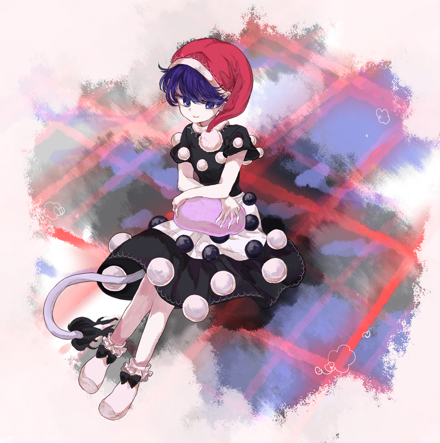 Description: A woman in a polka dot dress sitting on a pillow with a cat on her lap and a red hat on her head.