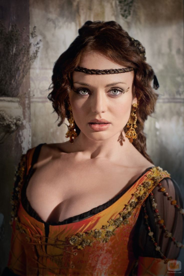 Description: A woman with a head piece and a dress on posing for a picture in a photo studio with a wall in the background.