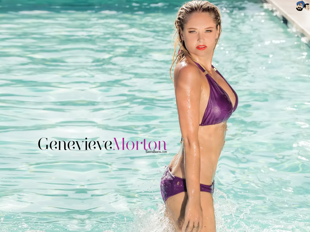 Description: A woman in a purple bikini standing in a pool of water with a boat in the background and a magazine advertisement for a magazine.