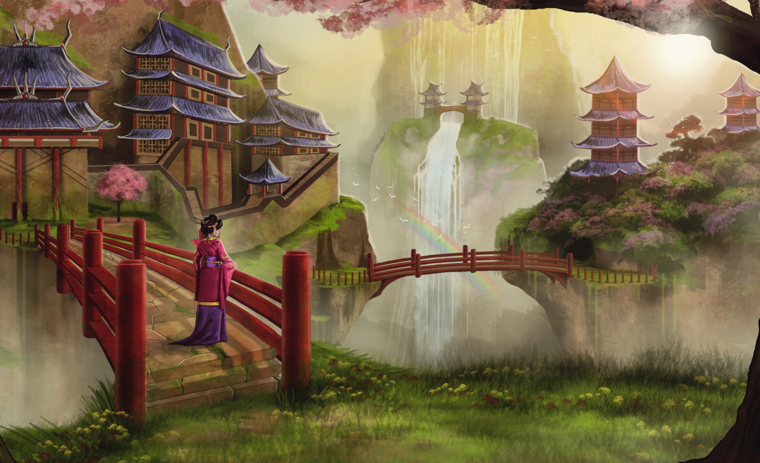 Description: A woman in a purple dress is standing on a bridge over a waterfall and a waterfall falls into the water.