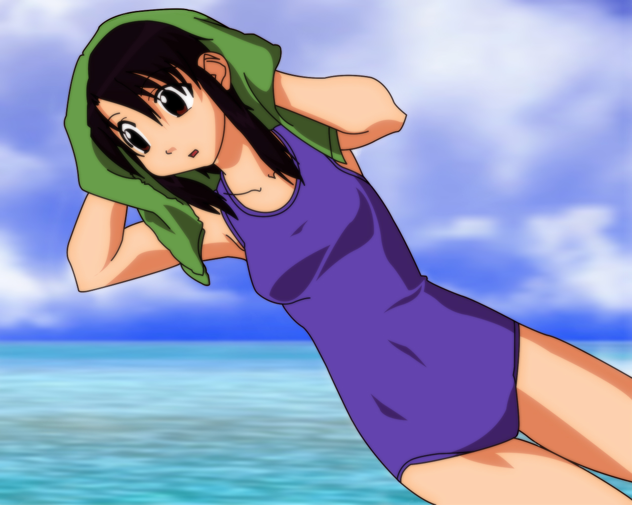Description: A woman in a purple dress is floating in the water with a green scarf around her neck and head.