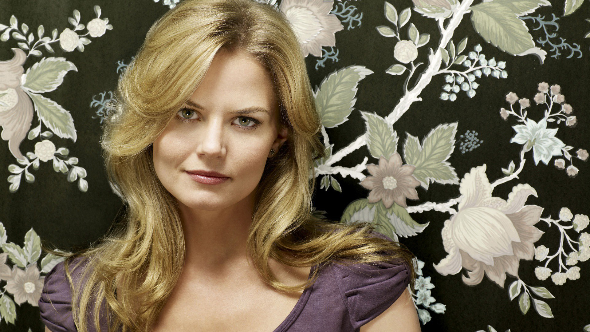 Description: A woman in a purple dress posing for a picture with a floral wallpaper behind her and a black background.