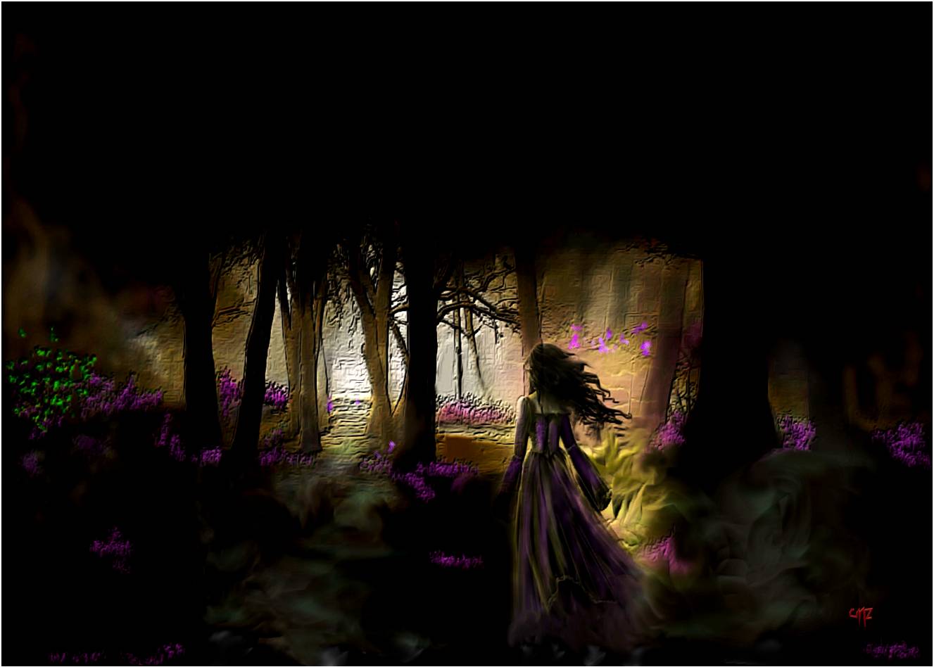 Description: A woman in a purple dress walking through a forest at night with purple flowers on the ground and trees.