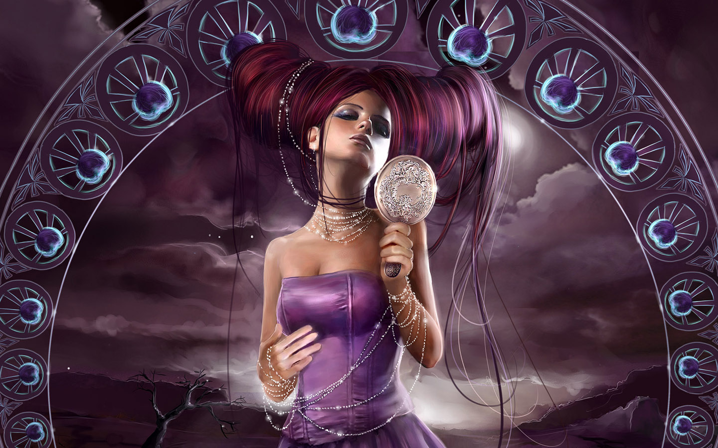Description: A woman in a purple dress holding a mirror in front of a clock with a purple background and a purple background.