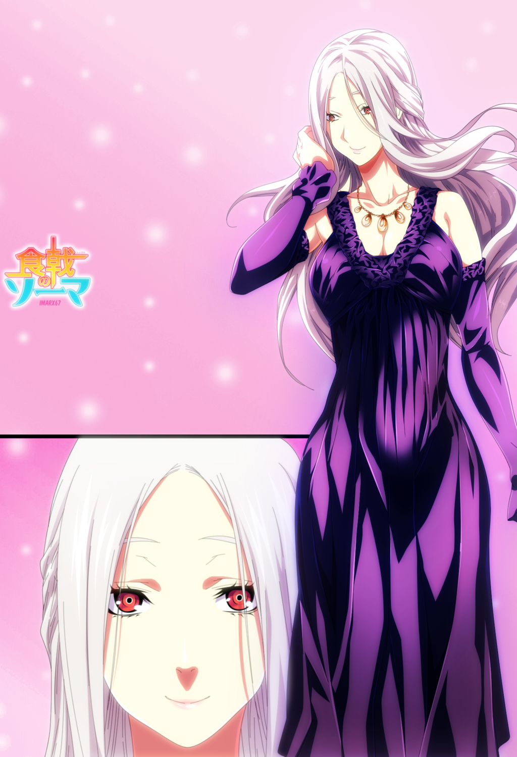 Description: A woman in a purple dress next to a woman in a pink dress with long white hair and a pink background.