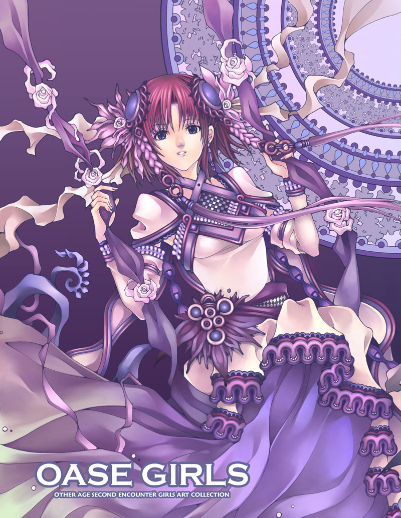 Description: A woman in a purple dress with a purple background and a purple background with a circular object in the middle.