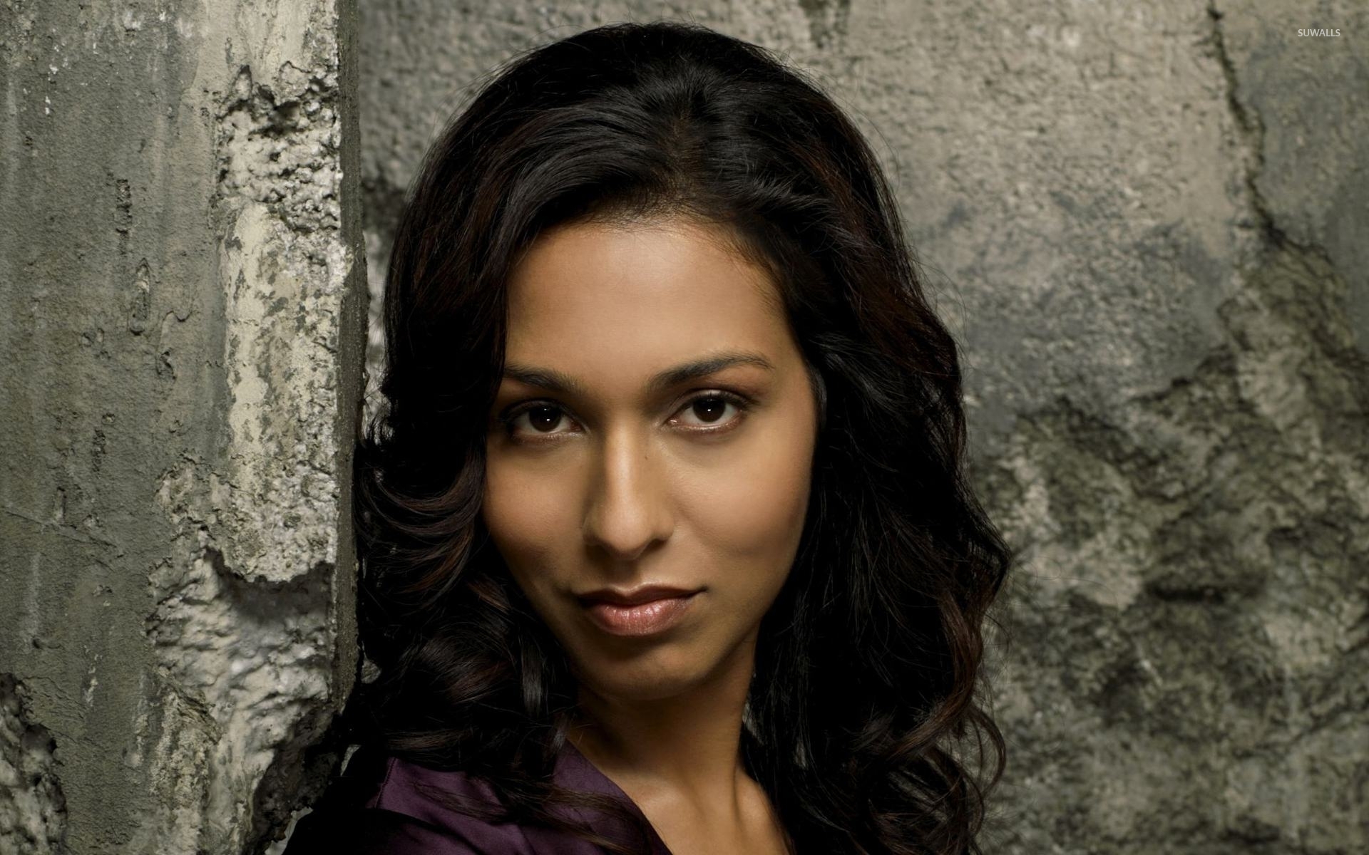 Description: A woman in a purple dress posing for a picture in front of a wall with a stone background and a gray brick wall.