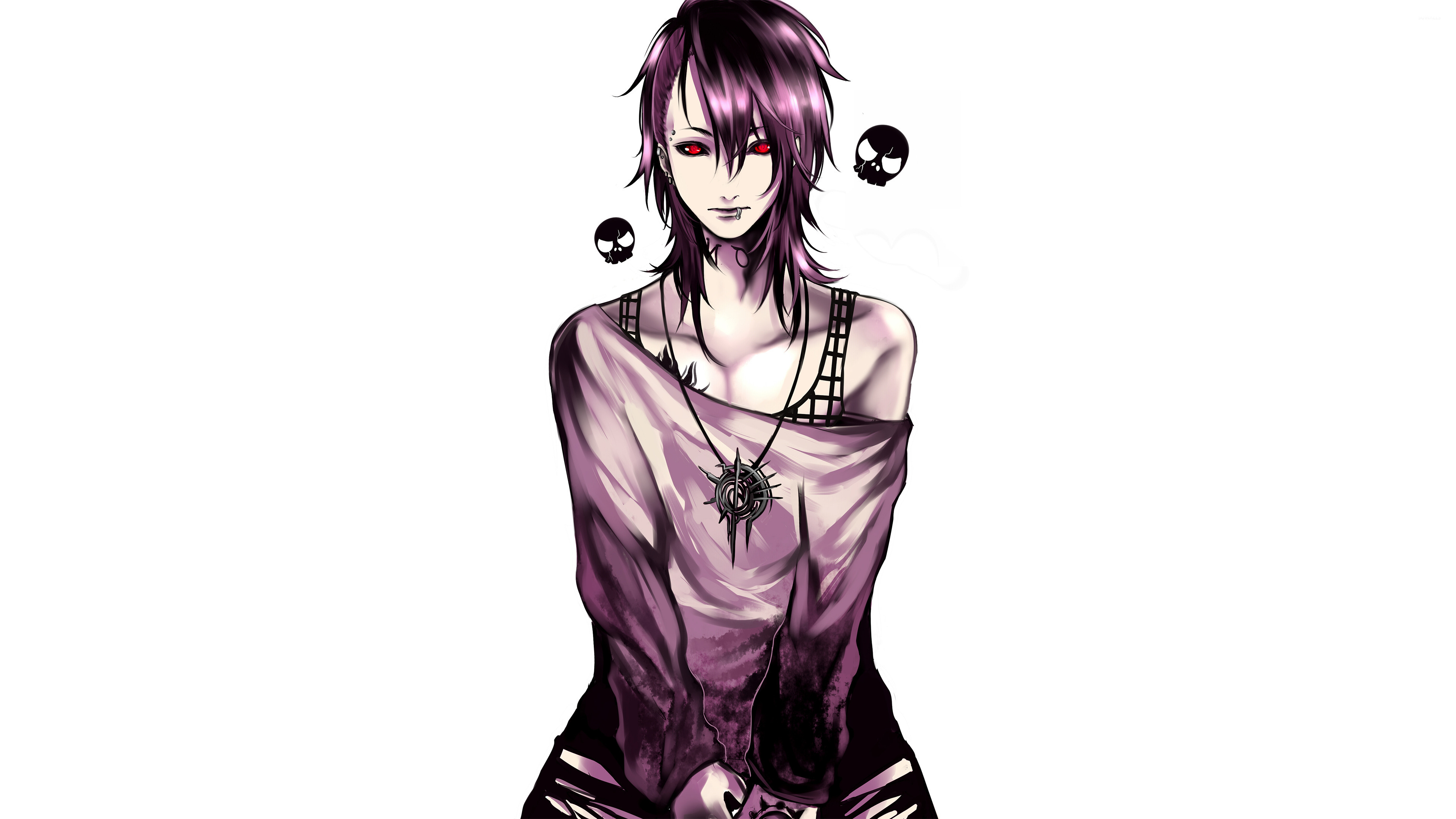 Description: A drawing of a woman with purple hair and a skull necklace on her neck and chest.