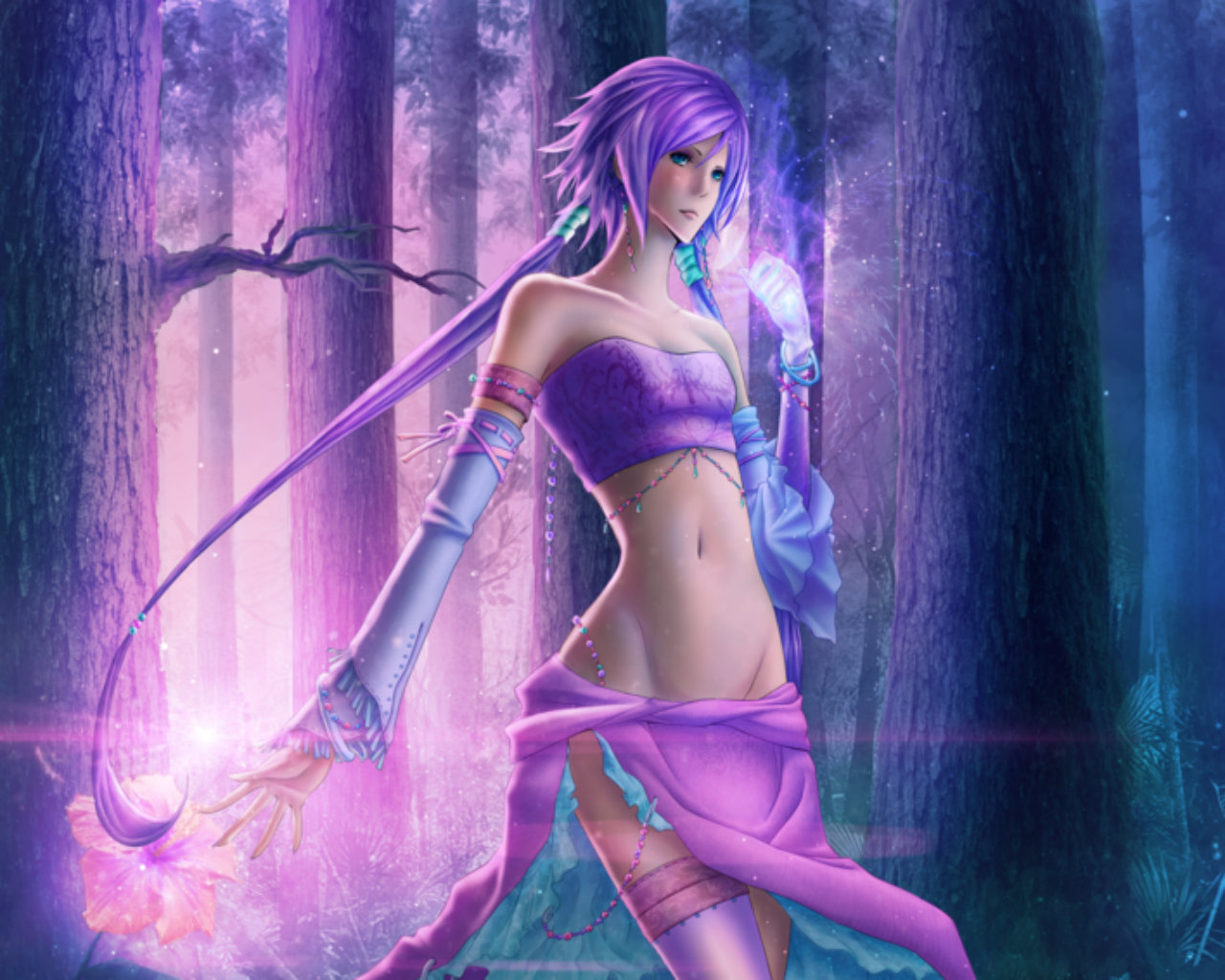 Description: A woman in a purple outfit holding a sword in a forest with trees and a purple light behind her.