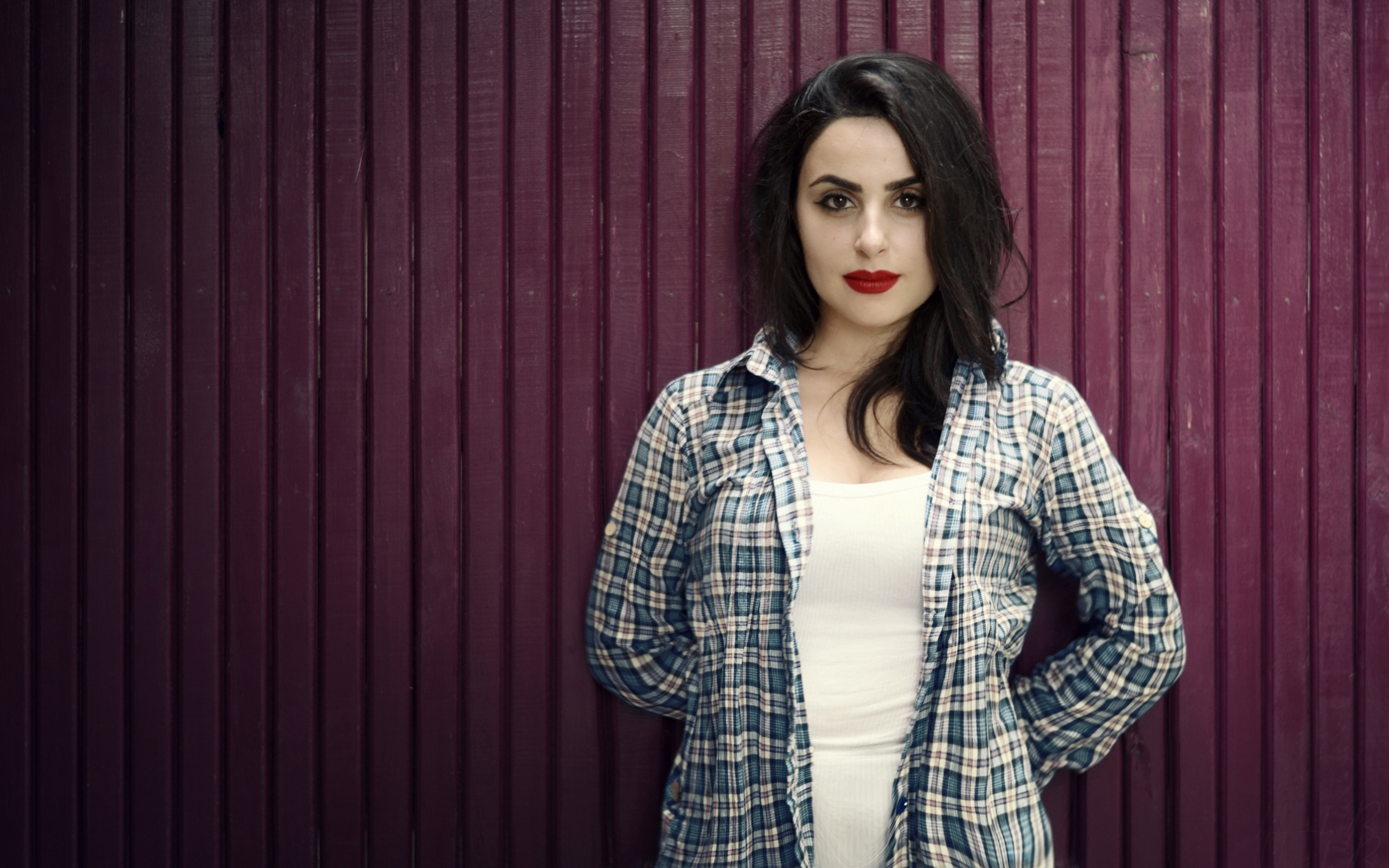 Description: A woman standing in front of a purple wall with her hands on her hips and her hands on her hips.