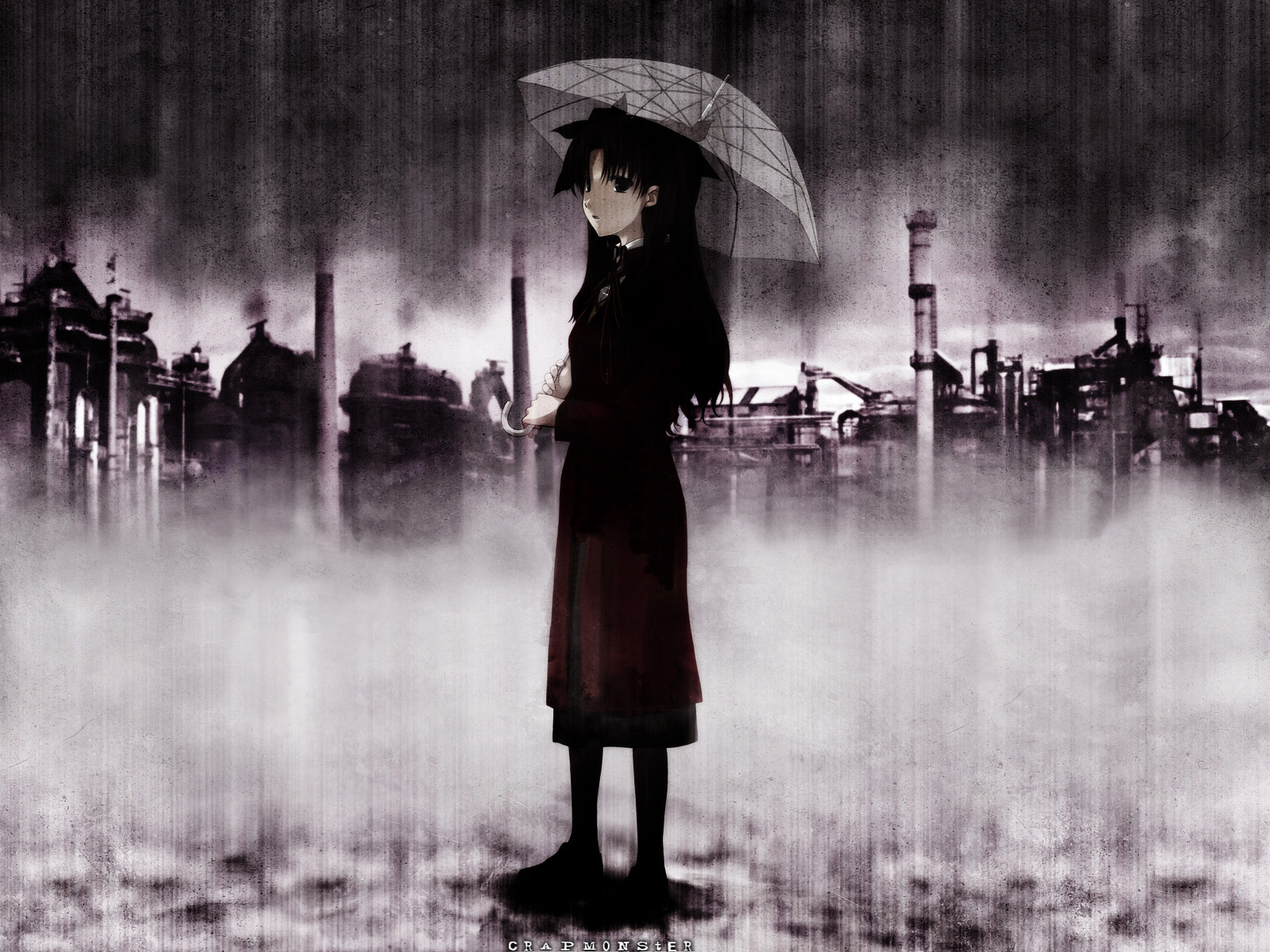Description: A woman standing in the rain holding an umbrella over her head and looking at a city in the distance.