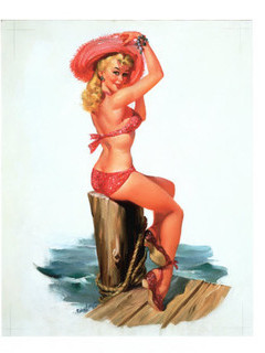 Description: A painting of a woman in a red bikini and hat sitting on a post in the water with a rope.