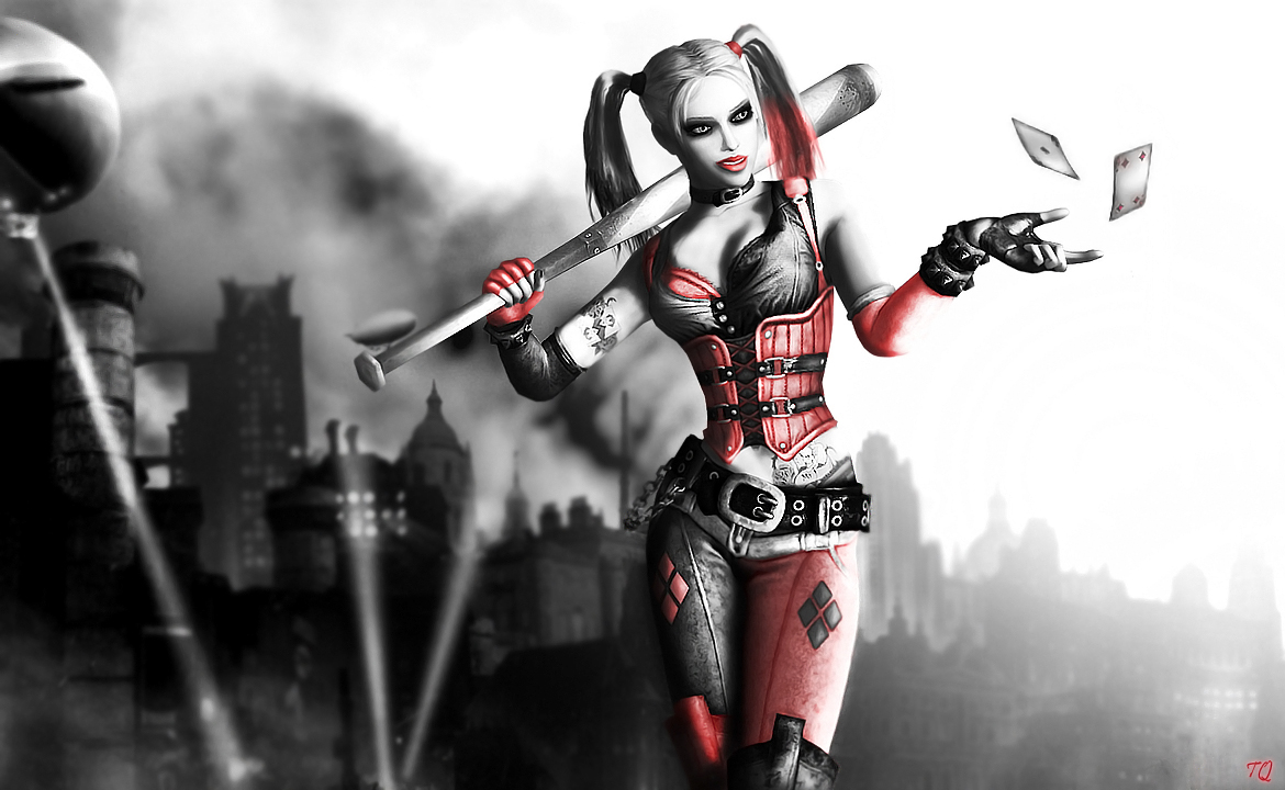Description: A woman in a red and black outfit holding a bat and a cell phone in her hand and a city in the background.