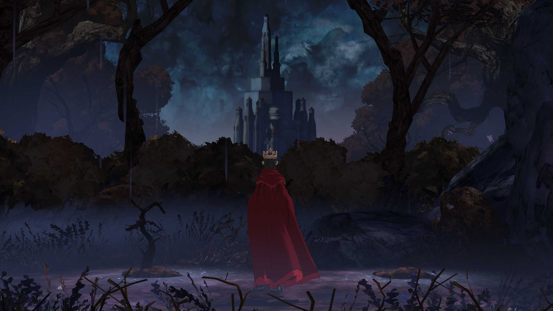 Description: A woman in a red cape standing in a forest at night with a castle in the background and a full moon.