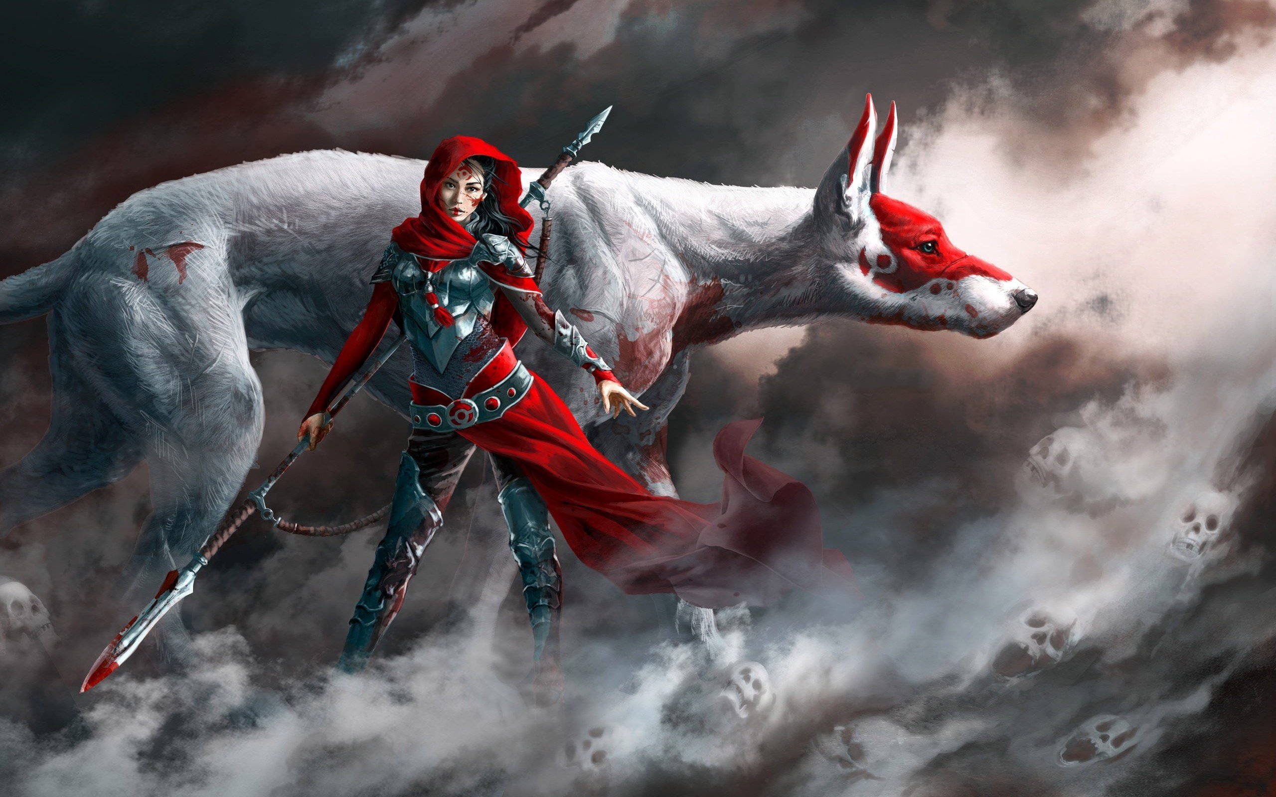 Description: A woman in a red cape and a white wolf in a cloudy sky with a sword in her hand.