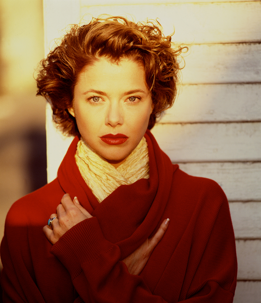 Description: A woman with a red coat and a red scarf around her neck and a ring on her finger.