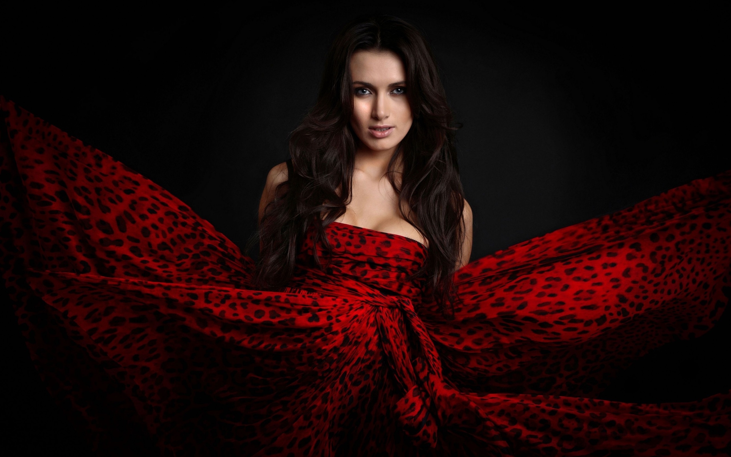 Description: A woman in a red dress with a black background and a black background with a red leopard print on it.
