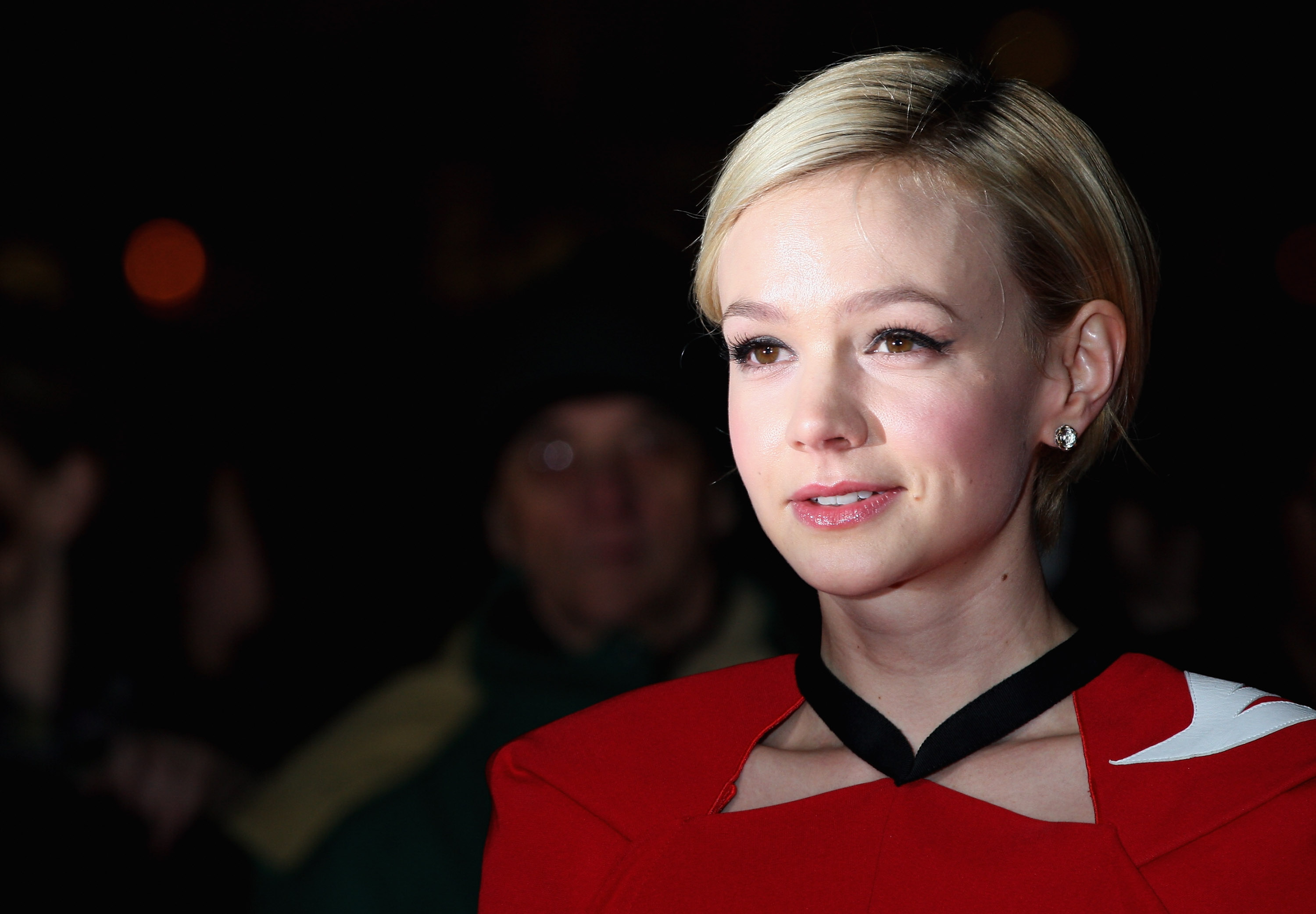 Description: A woman with a red dress and black collared shirt and a black tie and a black background with people.