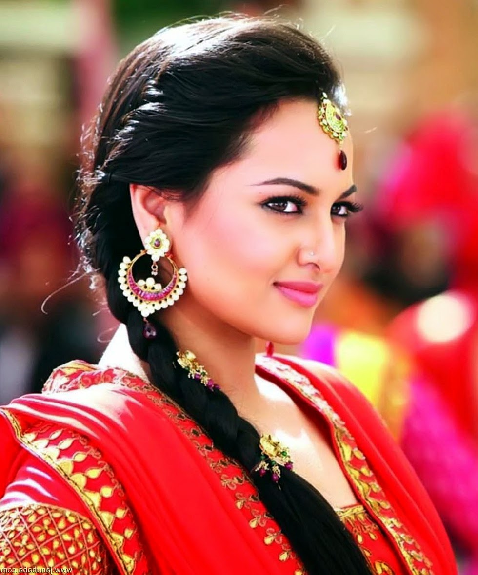 Description: A woman in a red dress with a braid and earrings on her head and a red dress with a gold and red design on her chest.