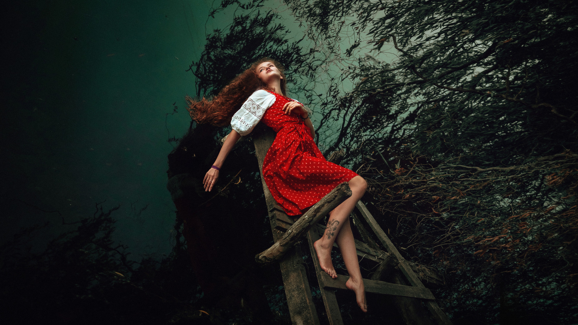 Description: A woman in a red dress is laying on a wooden bridge in the woods with her hair blowing in the wind.