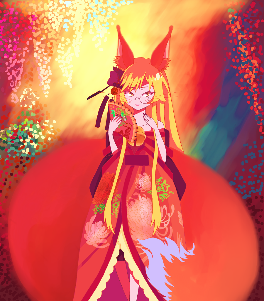 Description: A woman in a red dress with a cat on her shoulder and a cat on her shoulder.