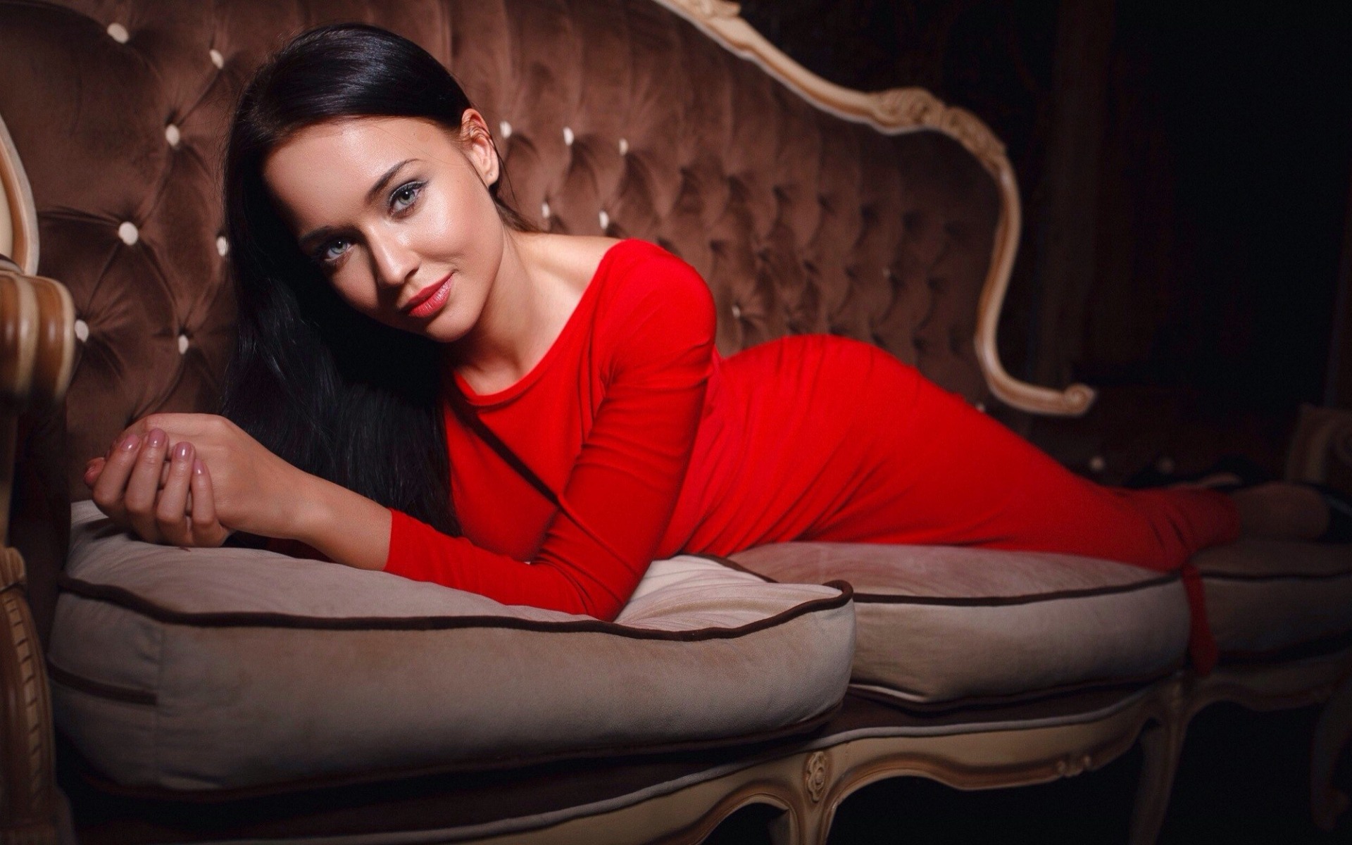 Description: A woman in a red dress laying on a couch with her arms crossed and her legs crossed.