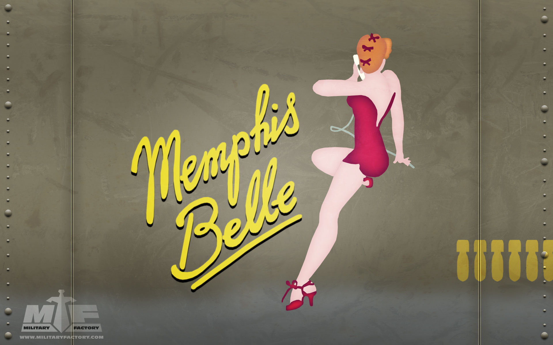 Description: A woman in a red dress is dancing on a metal background with words that read.