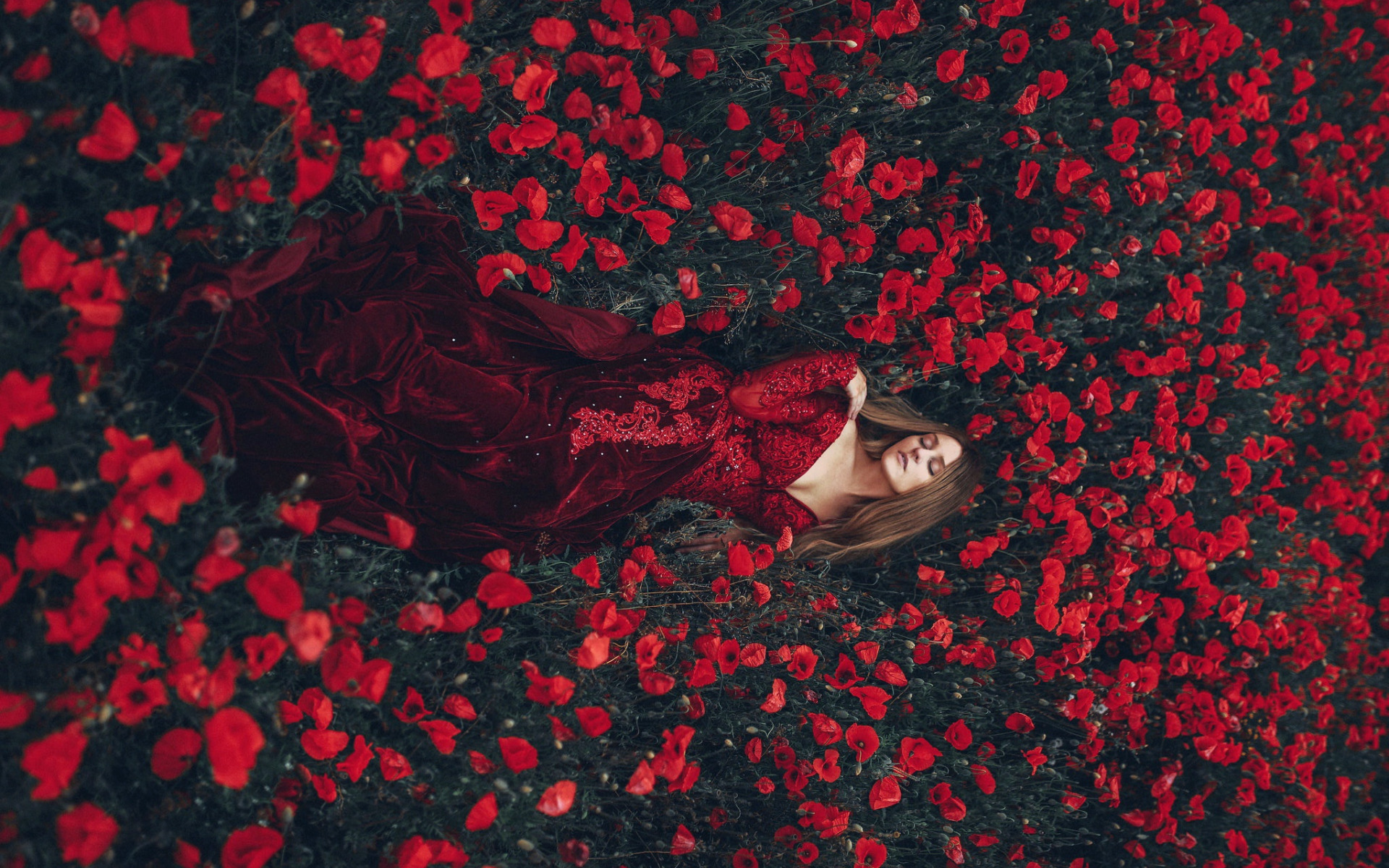 Description: A woman in a red dress laying in a field of red flowers with her eyes closed and her hair in a ponytail.