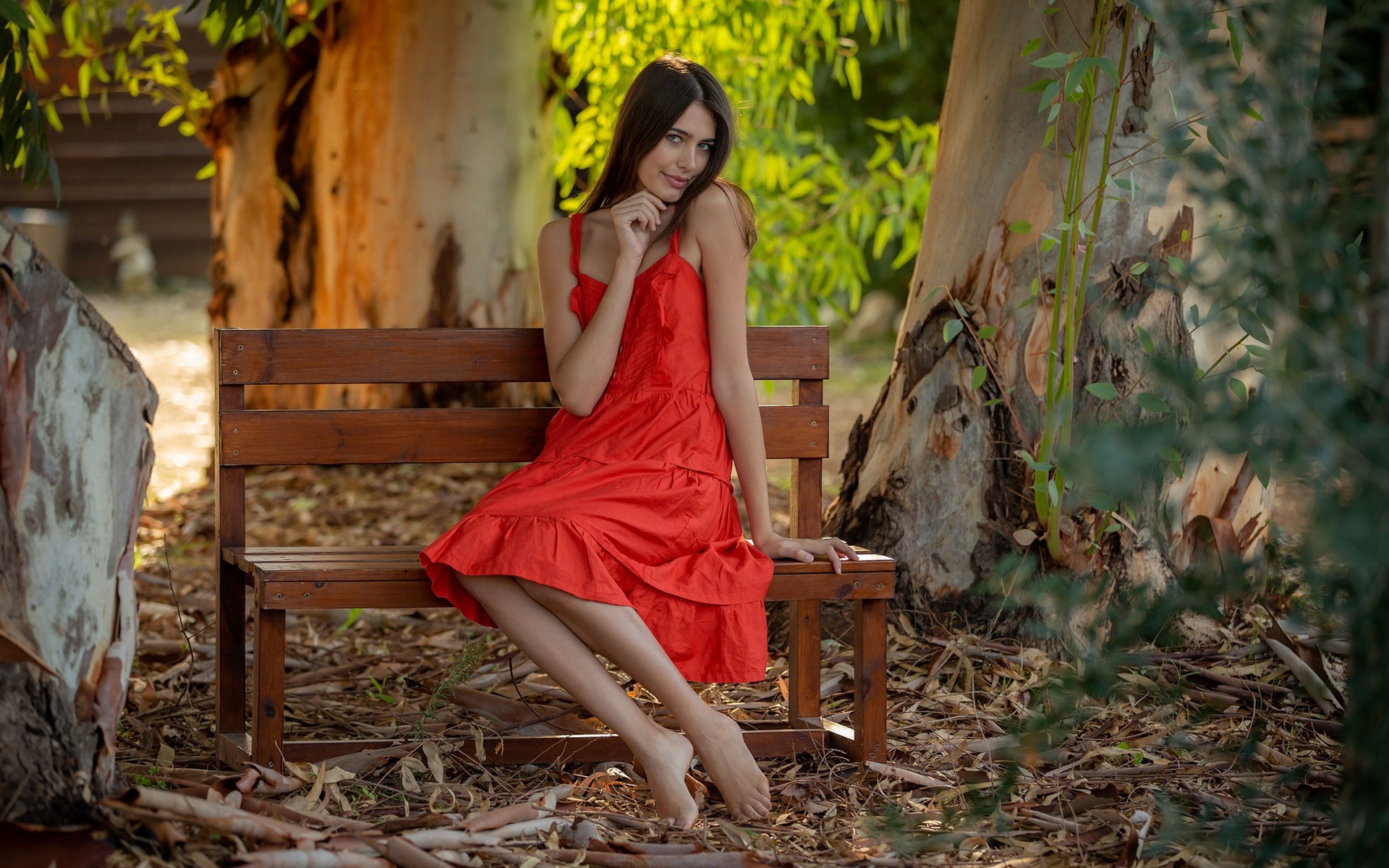 Description: A woman in a red dress sitting on a bench in a forest with trees and leaves around her.