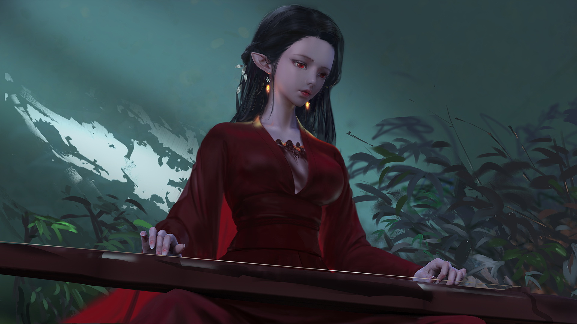 Description: A woman in a red dress sitting on a bench in a forest with a green background and a tree.