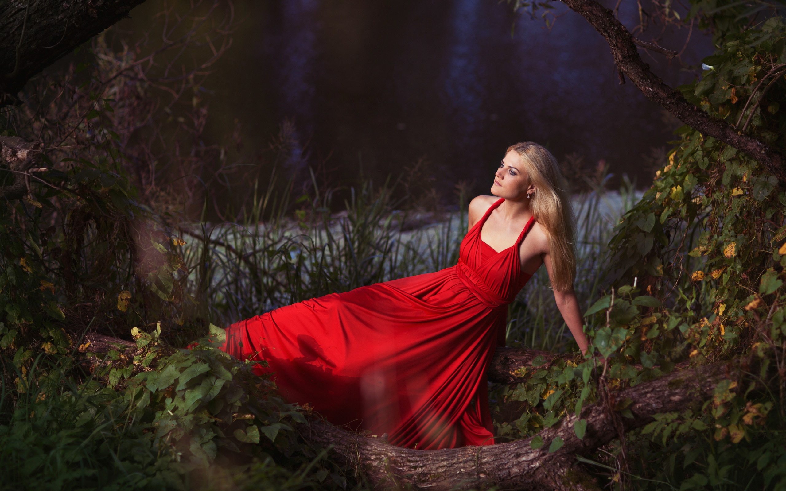 Description: A woman in a red dress is walking through the woods with a tree branch in her hand and a red dress on her shoulder.