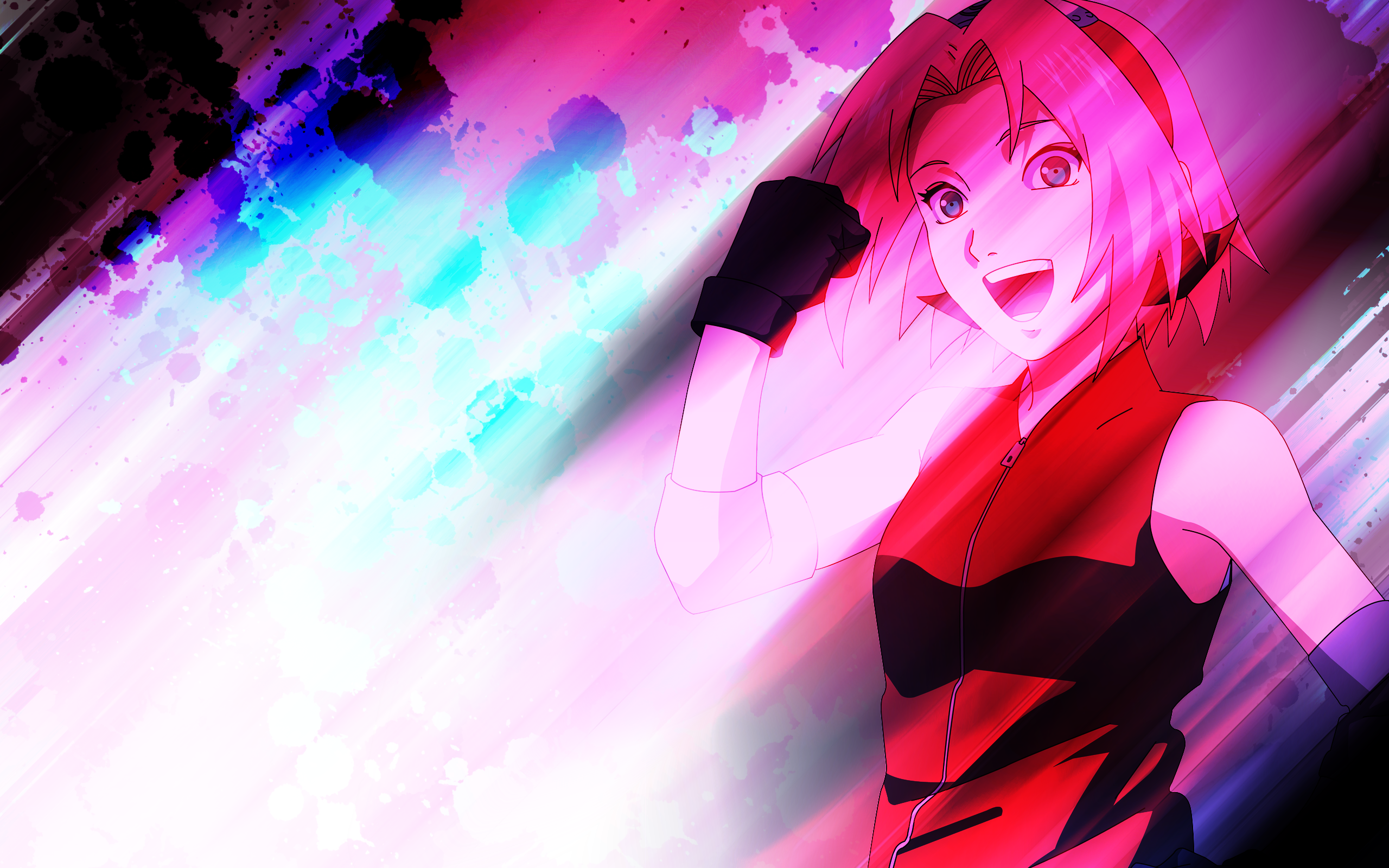 Description: A woman in a red dress holding a gun in her hand and a pink and blue background behind her.